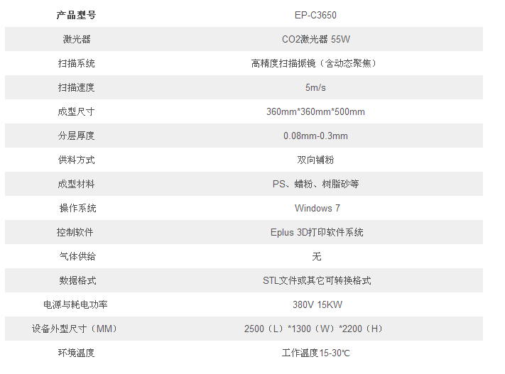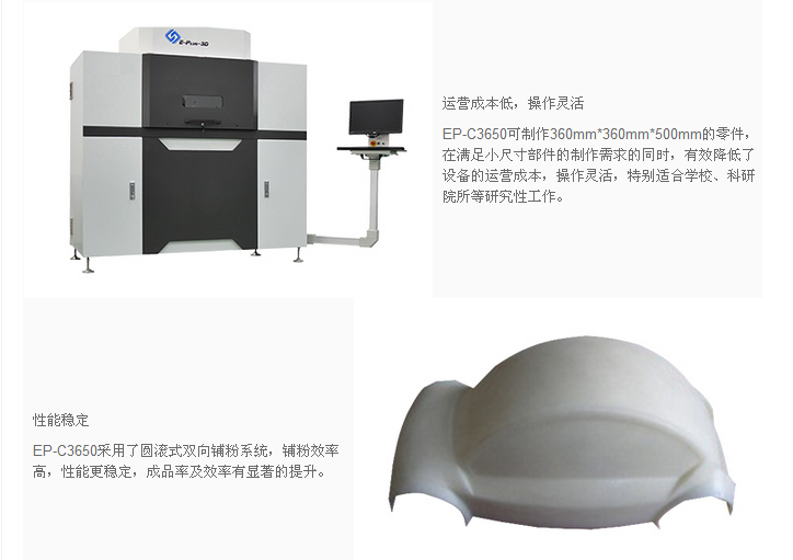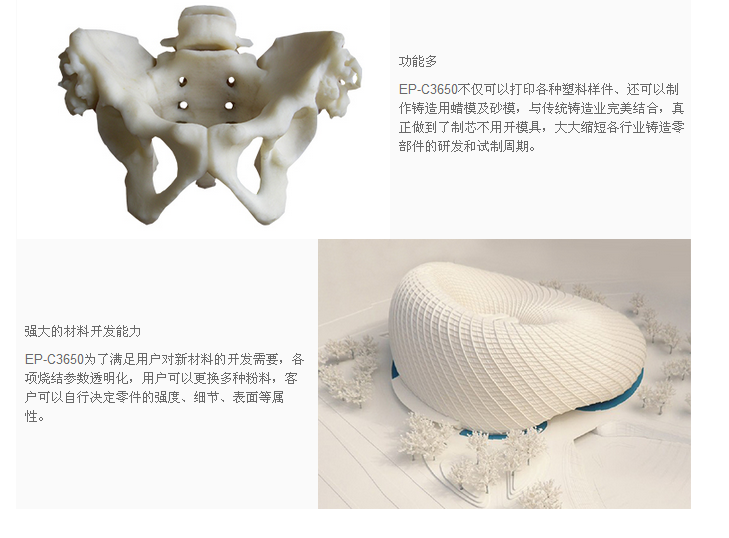 EP-C3650系列設(shè)備采用激光燒結(jié)技術(shù),以可消失熔模為成型材料,再通過與鑄造技術(shù)結(jié)合進行快速鑄造。