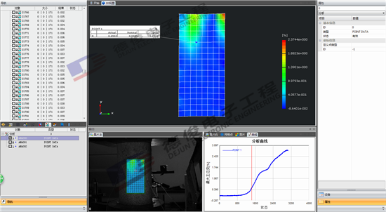 7. 測量結(jié)果:全場三維坐標(biāo)、位移、應(yīng)變數(shù)據(jù)等動(dòng)態(tài)變形數(shù)據(jù),應(yīng)變模式有工程應(yīng)變、格林應(yīng)變、真實(shí)應(yīng)變等三種。